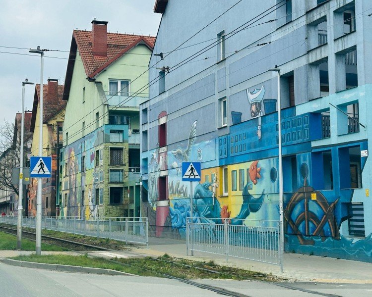 Самый колоритный район Вроцлава с многочисленными муралами находится на улице Opolskiej. Компания TBS Opolska, владеющая блоками, хотела таким образом оживить печальный район. Автор муралов – «Mural Szop». На своем сайте авторы описывают, что означает каждый элемент: