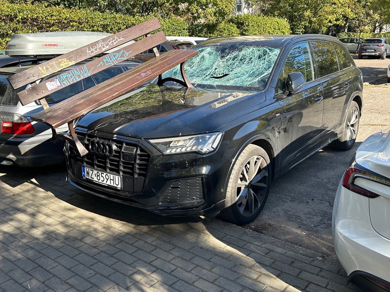 Оценка ущерба будет доступна после завершения полицейского расследования. На фотографиях видно, что скамейка в одной из машин оторвана от земли. У многих машин разбиты передние и задние стёкла.