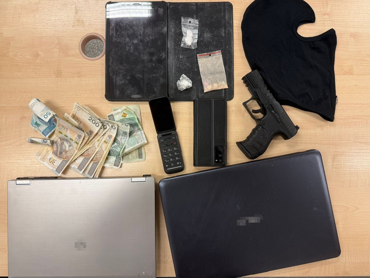 Вскоре оперативники задержали 39-летнего мужчину в Бжезинах. В ходе обыска его квартиры были обнаружены деньги, мобильные телефоны, ноутбуки, а также пневматический пистолет, балаклава, таблетки МДМА и несколько доз кокаина.