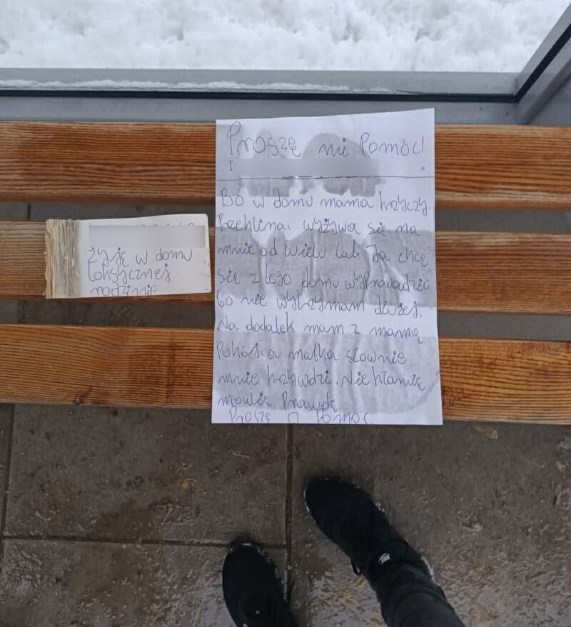 Жительница Варшавы поделилась в местной группе «Bielany Nasza Dzielnica» фотографией письма, которое она нашла на автобусной остановке на улице Drohickа. Всё указывает на то, что письмо было написано расстроенным ребёнком, ищущим помощи в сложной ситуации дома.