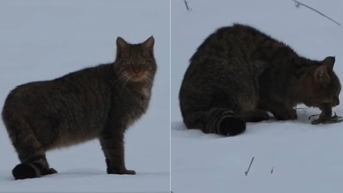 Европейского лесного кота, поедающего добычу на фоне заснеженного пейзажа, сняли на видео в польских Бещадах. По оценкам, в Польше сохранилось всего 200 диких кошек, в основном в горной местности на юго-востоке страны.