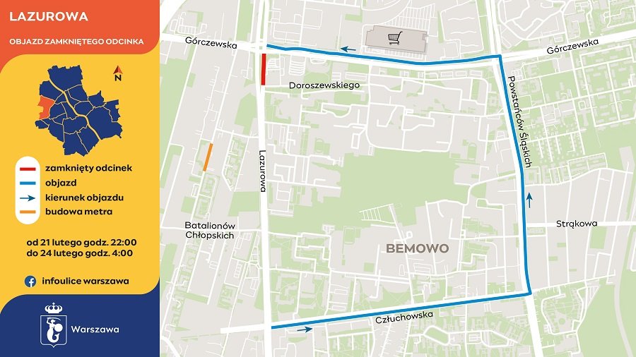 С вечера пятницы, 21 февраля, до утра понедельника, 24 февраля, на участке улицы Lazurowej между Doroszewskiego и Górczewską в направлении кольцевой развязки будет ограничено движение из-за строительства метро. В это время первый тоннелепроходческий щит (TPM) будет прокладывать тоннель линии М2 в районе будущей станции «Лазурова».