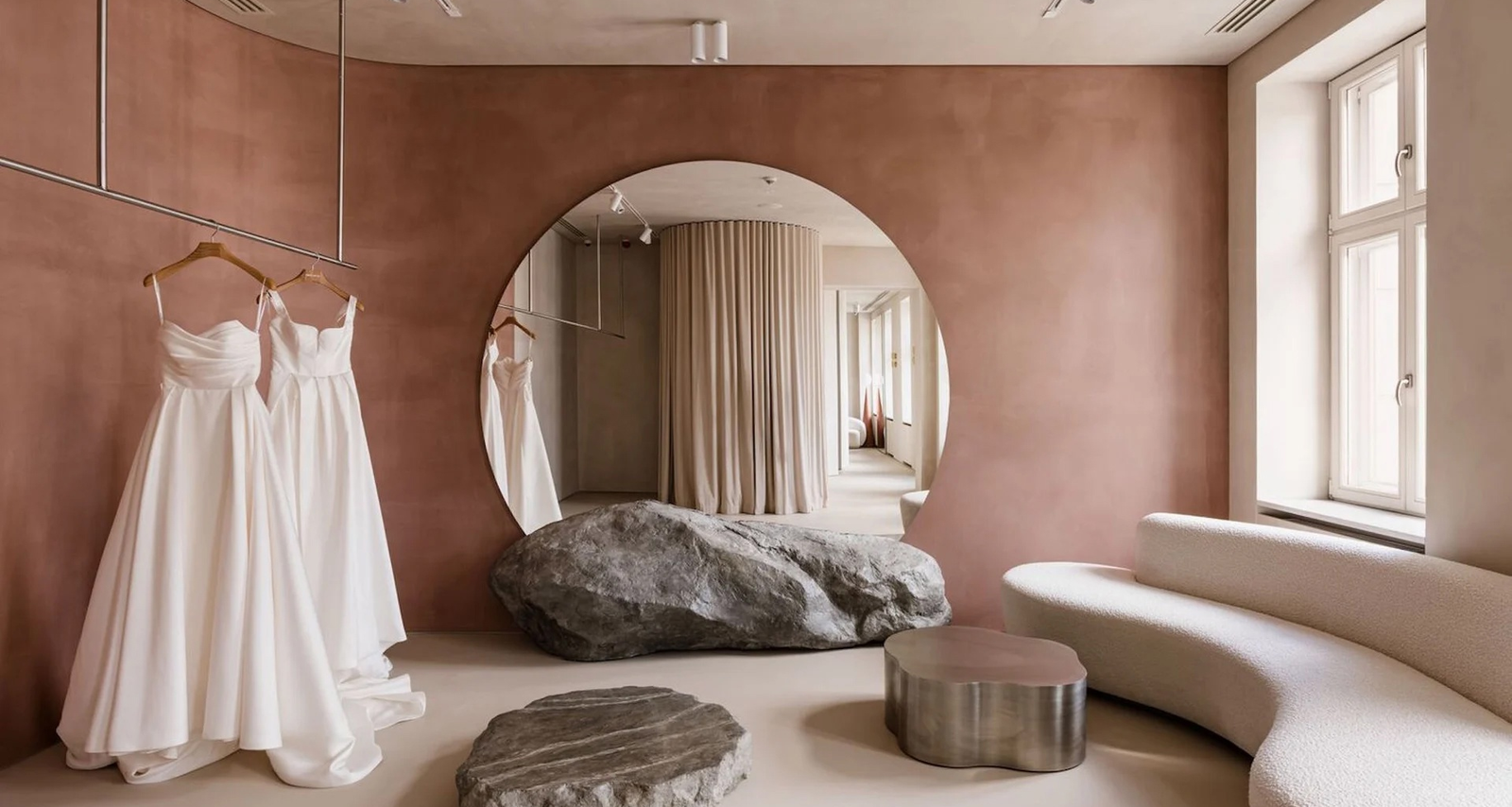 Обстановка бутика довольно строгая, особенно для салона свадебных платьев. При его проектировании архитекторы вдохновлялись «космическим минимализмом» из фильма Стэнли Кубрика «2001 год: Космическая одиссея». В оформлении преобладают оттенки серого, в некоторых комнатах присутствуют бежевые и землистые тона. Главная особенность салона — «валуны» из гипса и пенопласта, которые окрашены так, что напоминают натуральные камни. Некоторые из них выполняют не только эстетическую функцию, но и практическую: это платформы, на которые может ступить будущая невеста и предстать в своем наряде.