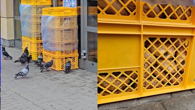 В сети появилось видео, на котором видно, как голуби клюют хлеб, оставленный возле одного из магазинов в Варшаве. Автор записи утверждает, что продукция была доставлена после 7:00, а сам магазин должен был открыться только в 9:00. В это время упаковки с хлебобулочными изделиями остались без присмотра у входа, что привлекло птиц.
