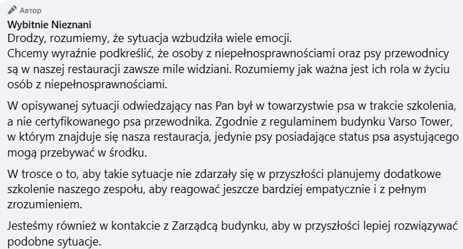 Заведение попыталось объяснить ситуацию ссылкой на «регламент» Varso Tower, который якобы запрещает посещение с собаками без официального статуса поводыря. Однако представители комплекса заявили, что никаких таких ограничений нет, подчёркивая, что Varso Tower сертифицирован как «объект без барьеров» и открыт для людей с инвалидностью и их собак-поводырей.