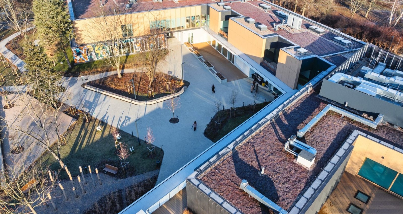 На территории высажено 80 деревьев, сотни кустарников и декоративных трав. Установлены ящики для стрижей, а также посажен цветочный луг. Для полива растений в засушливые периоды предусмотрен резервуар для дождевой воды. Почти вся крыша покрыта зеленью, а вдоль стен высажены виноградные лозы, создающие зеленый фасад. Облицовка здания выполнена из панелей, штукатурки и керамической плитки, что органично вписывается в окружающий ландшафт, включая соседний парк. Строительство обошлось в 36,8 млн злотых.