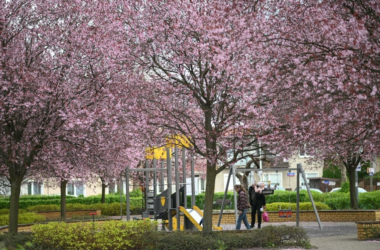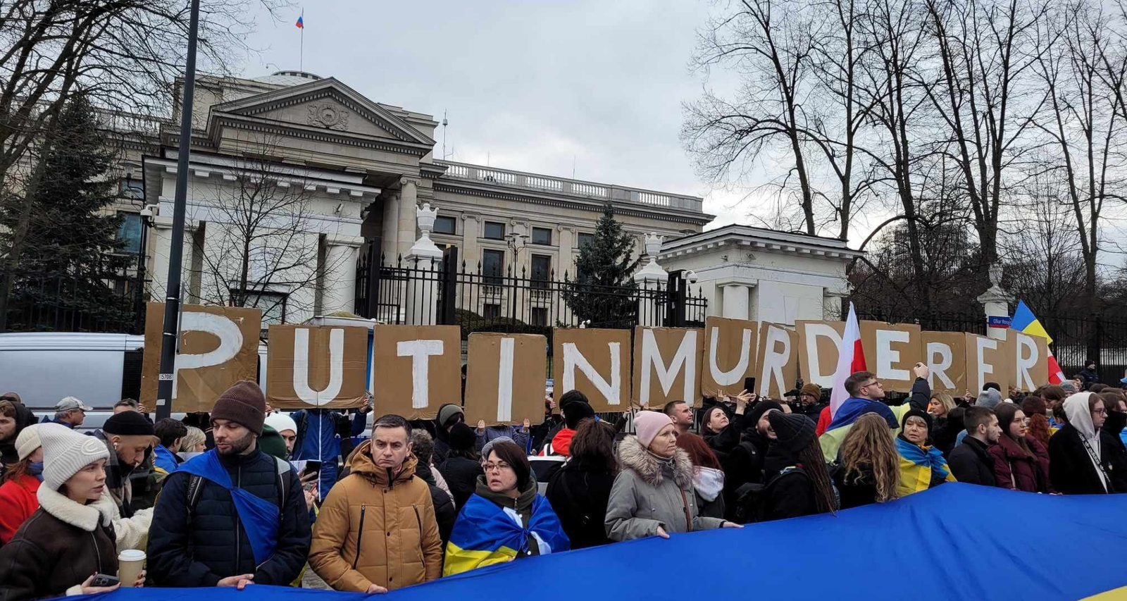 Перед зданием посольства была установлена инсталляция — макеты многоквартирных домов, разрушенных российскими бомбами. К каждому приклеен листок с названием украинского города, в том числе: Бахмут и Мариуполь. Перед моделями блоков также стоят десятки деревянных крестов с украинскими флагами и свечами. На каждом есть имя жертвы, возраст и пометка «killed by russians».