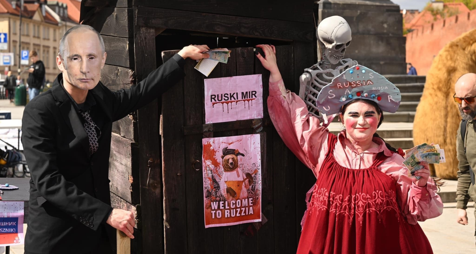 Сегодня, 6 апреля в 12:00, польские и украинские активисты провели перформанс “Міжнародний ярмарок геноциду” на Замковой площади в Варшаве в знак протеста против дальнейшей торговли Евросоюза с Россией и c призывом ЕС ввести полное эмбарго на российскую продукцию.