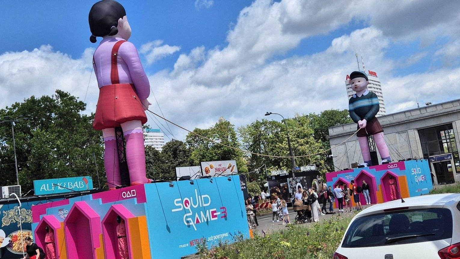 В связи с финальным сезоном корейского хита от Netflix «Игра в кальмара» перед Дворцом культуры и науки в Варшаве были размещены известные по сериалу декорации, где можно было сфотографироваться среди персонажей в характерных розовых комбинезонах, которые маршировали каждые полчаса.