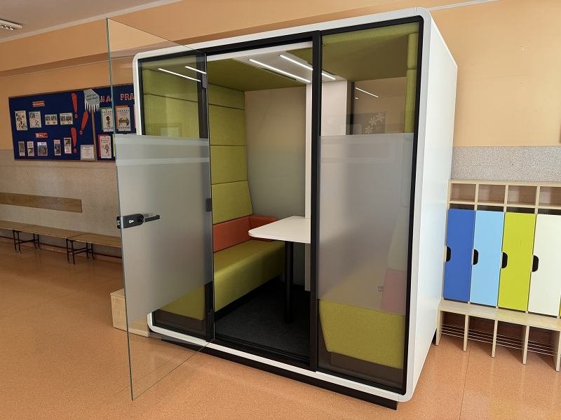 Например, с марта этого года в Zespół Szkolno-Przedszkolny № 2 в Легионово уже установил акустическую кабинку. Она предназначена для тихой работы с детьми и звукоизолирована специальными материалами. Поэтому, несмотря на то, что она находится в школьном коридоре, её можно использовать для индивидуальной работы. В ней могут разместиться 4 ребёнка и учитель. Кабина оснащена электропитанием, интернетом и вентиляцией.