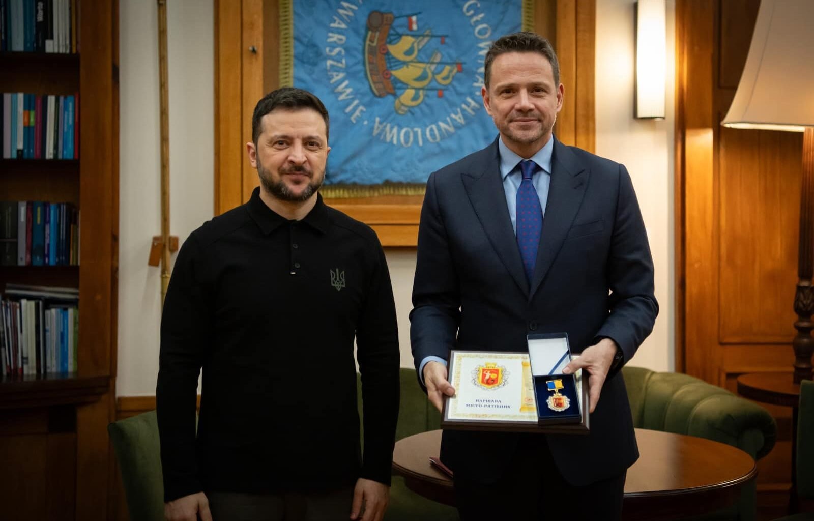 Во время своего визита в Варшаву президент Украины встретился с мэром столицы Рафалом Тшасковским. Во время их встречи мэр Варшавы принял благодарности от Владимира Зеленского, который вручил городу звание «Город-спасатель» за поддержку украинских беженцев с начала 2022 года.