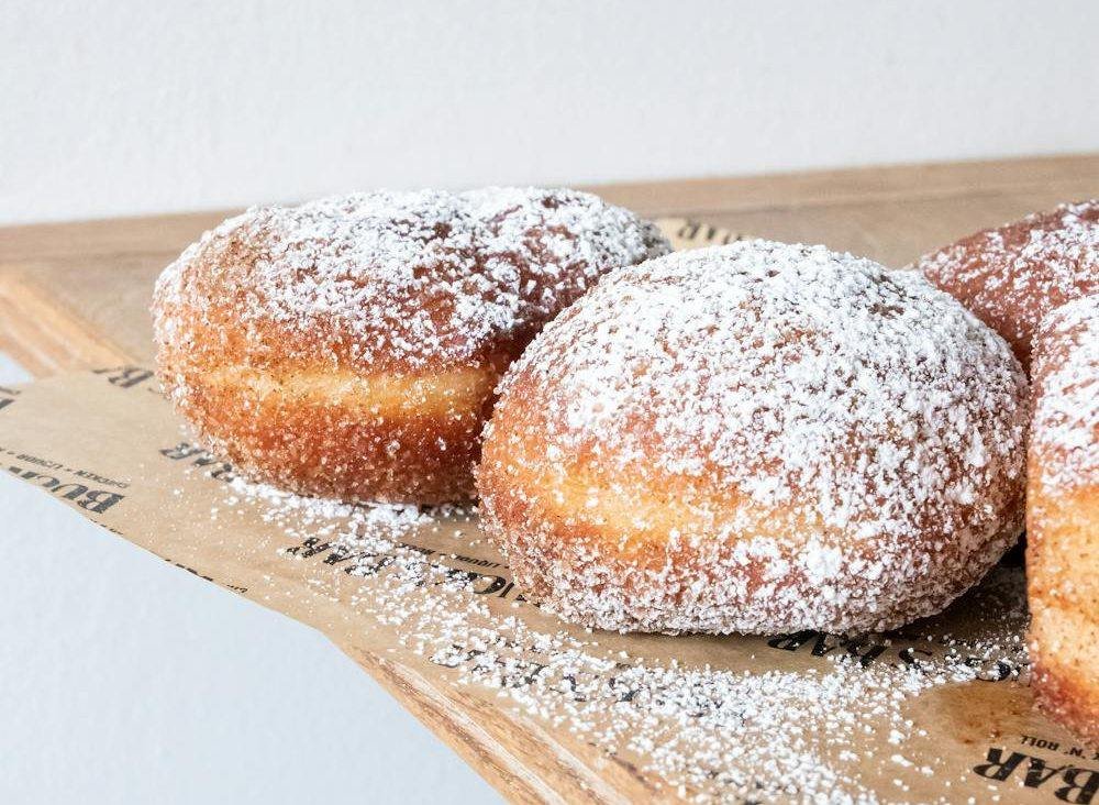 Есть несколько вкусов пончиков на выбор: с начинкой из розового джема, посыпанные сахарной пудрой или глазированные глазурью, с фисташковым кремом, с начинкой из чёрной смородины, с малиной или с начинкой из манго и маракуйи.